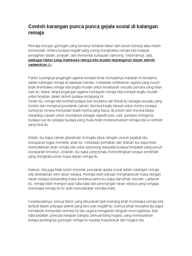 Karangan Masalah Sosial Contoh Karangan Punca Punca Gejala Sosial Dalam Kalangan Remaja Check spelling or type a new query. Paling penting perlu dititik beratkan ialah tentang agama. Masalah sosial seperti gejala melepak lumba haram buli dan sebagainya semakin hangat diperkatakan dari buah mulut masyarakat malah.